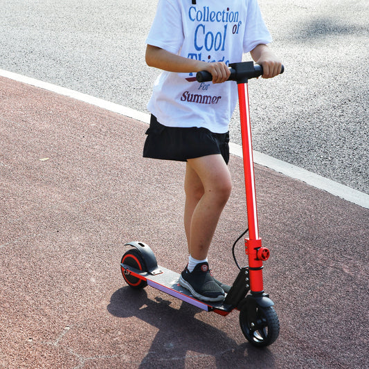 WEELMOTION Classic RED Kids Electric Scooter, 6.5" Solid Tire with front Led lights and multicolor rainbow lights; foldable kick scooter for kids with LED display, Max range 8 kms Range