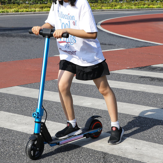 WEELMOTION Classic Blue 6.5 Inch Electric Scooter for kids, 150W Motor with front Led lights and colorful rainbow pedal lights ; easy-fold scooter for kids with LED display